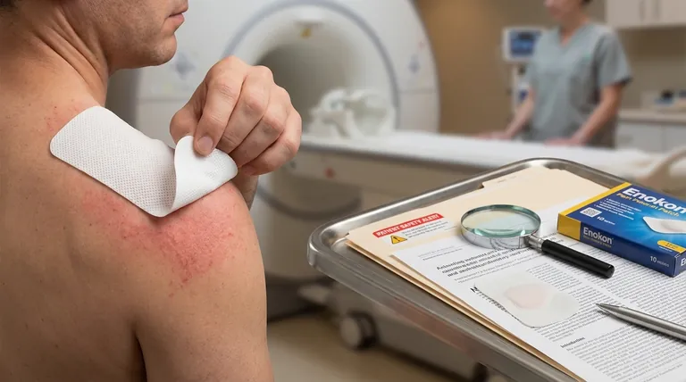 Além do risco de queimaduras de ressonância magnética, a proximidade a fontes de calor externas (como uma bolsa de água quente) pode acelerar perigosamente a absorção de medicamentos, levando a uma possível overdose. Esta é uma consideração crítica de design e rotulagem que é frequentemente comunicada de forma inadequada.