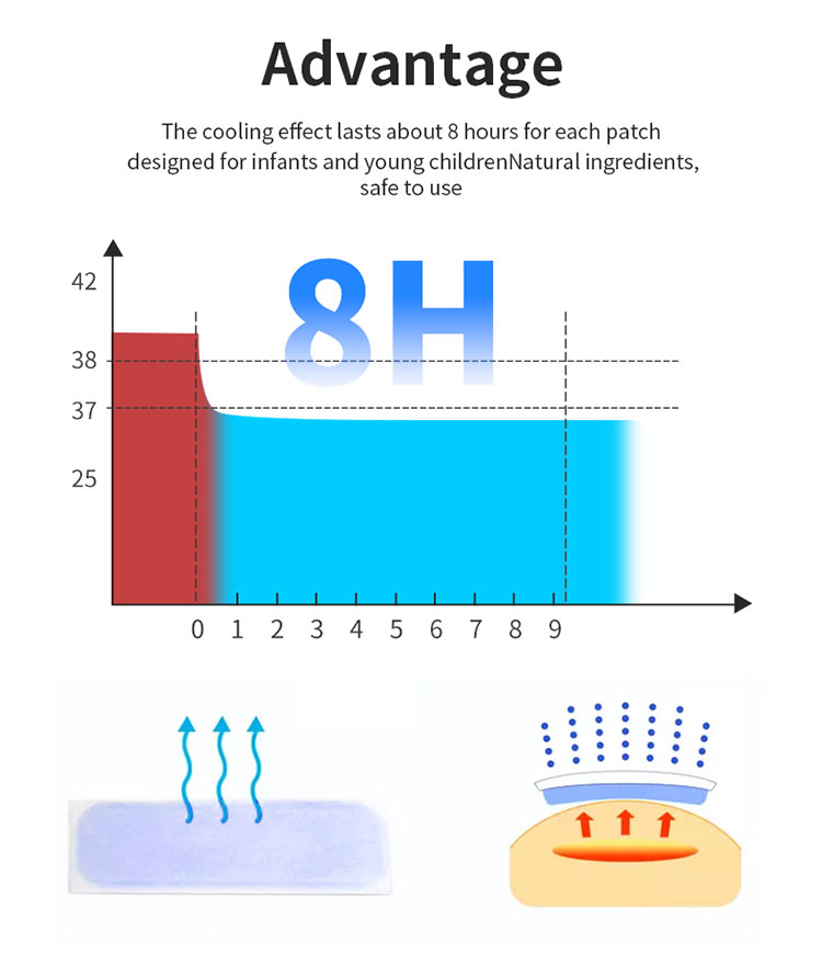 | Apelo do produto principal | Redução suave da febre, conforto refrescante, sem medicamentos, alívio da dor, amigo das crianças |